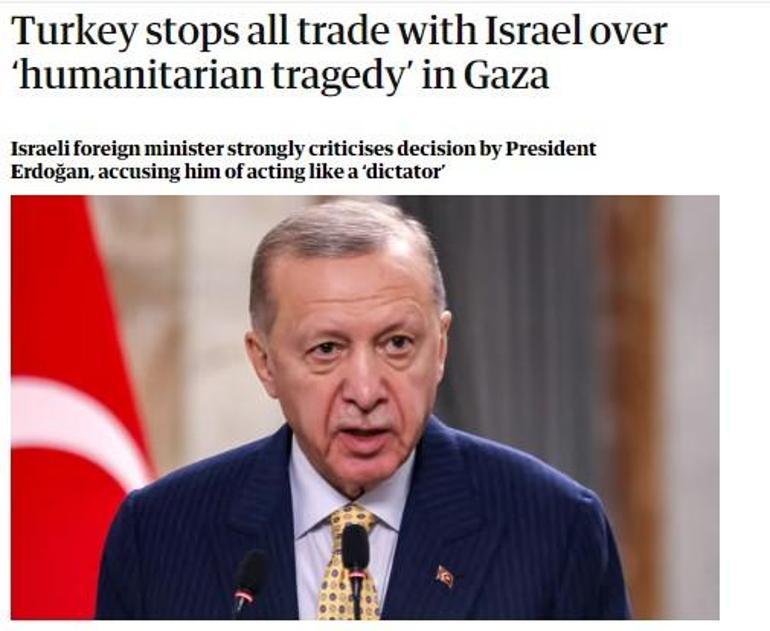 İngiliz Guardian gazetesi Türkiye'nin Gazze'deki 'insani trajedi' nedeniyle İsrail'le tüm ticareti durdurduğunu yazdığı haberinde söz konusu hamlenin, eski iki yakın müttefik arasında kötüleşen gerilimi daha da derinleştireceğini iddia etti.