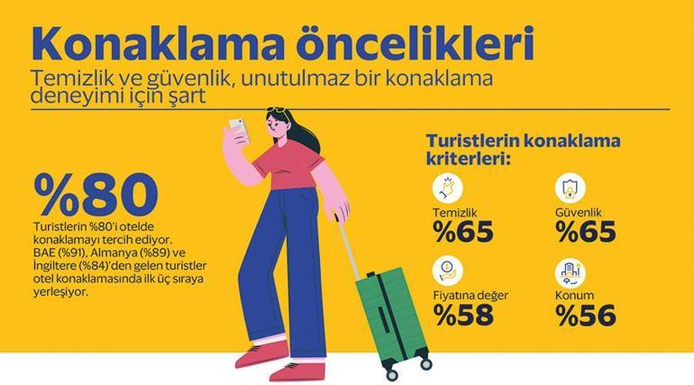 * Türkiye’yi ziyaret eden turistlerin yüzde 80’i konaklamak için otelleri tercih ediyor. Bu alanda BAE (yüzde 91), Almanya (yüzde 89) ve İngiltere (yüzde 84) öne çıkıyor.