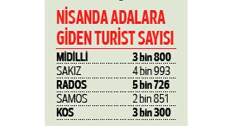 Yunan adalarına kapıda vize uygulaması bayramda başarılı geçti. Bayram haftasında Yunan adalarına giden Türk turist sayısı geçen yılın aynı dönemine göre üç kat arttı. Geçen yıl nisan ayının ilk 10 gününde Midilli’ye 390 turist gelirken, bu sayı 3 bin 800’e çıktı. Sakız Adası’na gelen turist sayısı 2 bin 716’dan 4 bin 993’e, Samos’a gelen turist sayısı 299 iken 2 bin 851’e, Kos’a gelen turist sayısı 2 bin 400’den 3 bin 300’e, Rodos’a gelen ise 2 bin 320’den 5 bin 726’ya yükseldi. Toplamda, bu beş adaya gelen turist sayısı 2023’te 5 bin 969 iken şimdiden 20 bin rakamını aştı. Turizmciler adalara giden Türk turistlerin memnun olduğunu ve yoğunluğun sezonda da devam etmesini beklediklerini söylüyor. Ayrıca adalara giden feribotların kalktığı Çeşme, Ayvalık, Kuşadası, Marmaris ve Fethiye gibi bölgelerde de kalan tatilciler buradaki esnafın da yüzünü güldürdü.