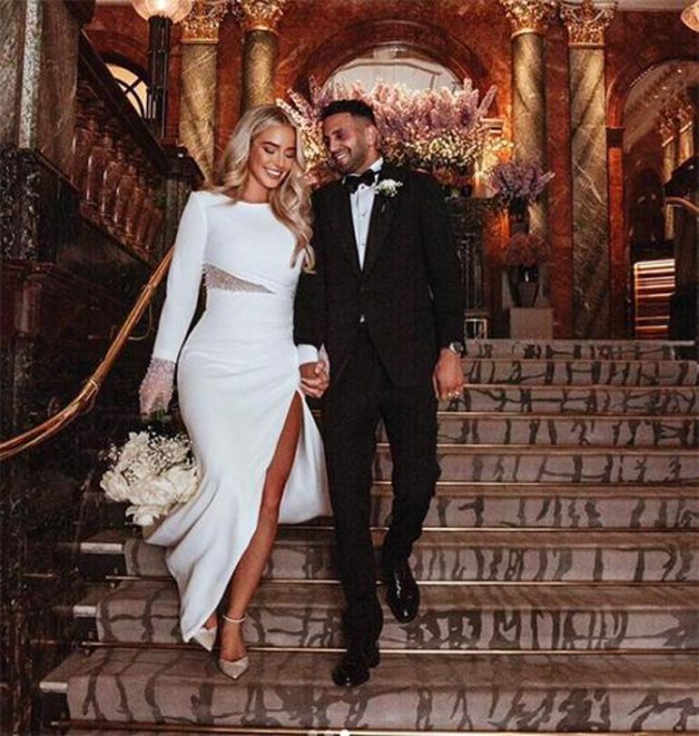 Damat Riyad Mahrez, koyu renkli klasik bir takım elbise tercih ederken gelin Taylor Ward ise sade ama çok şık bir gelinlik giydi.