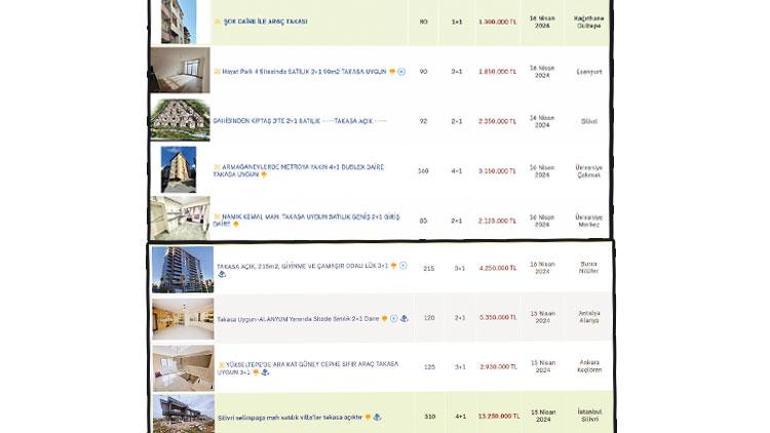 Ağırlıkla ikinci el konutlar olmakla birlikte ilanlarda sıfır konutların da takasla satışta olduğu görülüyor. ‘Takasa açık’, ‘Takasa uygun’ başlıklı ilanlarda, mal sahipleri araç, arsa ya da başka bir evle değişime sıcak baktıklarını belirtiyor.