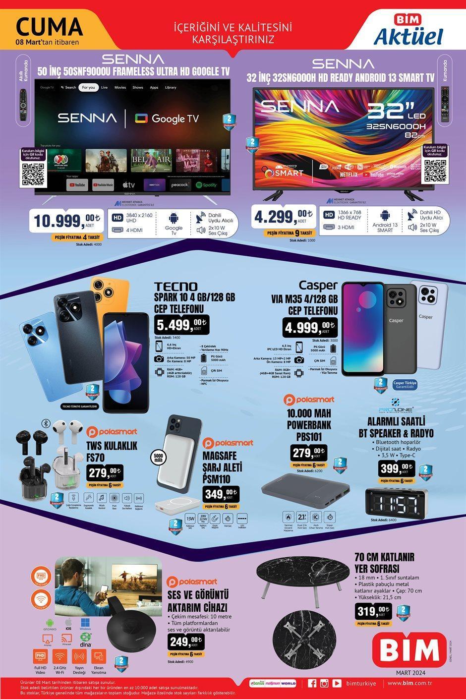 BİM katalog ürünleri haftanın indirimleri belli oldu. BİM aktüel 6 Mart 2024 kataloğu raflarda yerini almaya hazırlanıyor. BİM 8 Mart 2024 aktüel kataloğu içerisinde; Senna 32′ HD Ready Android 13 Smart Tv 4.299 T, Tecno Spark 10 Cep Telefonu 5.499 T, Casper VIA M35 Cep Telefonu 4.999 TL’ satışta olacak. Ayrıca Ramazan’a özel mutfak ürünleri satışta olacak. Peki, BİM’de bu hafta neler var? İşte, BİM aktüel ürünler kataloğu 8 Mart 2024 tamamı!
