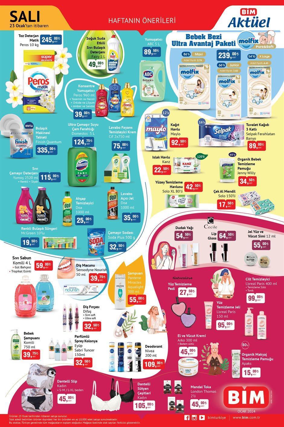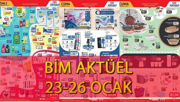 BİM aktüel katalog ürünleri belli oldu. BİM’de bu hafta cuma ve salı günleri neler var merak ediliyor. BİM katalog aynı zamanda bim online bim.com.tr adresinden de satın alınabiliyor. BİM’de bu salı bebek bezi, market ürünleri, temizlik malzemeleri raflarda olacak. Ayrıca, BİM aktüel 26 Ocak 2024 kataloğu içerisinde; Kumandalı Arazi Aracı 359, TL, Dijitsu 75′ UHD Google Tv 23.999 TL, TCL 32′ FHD Android Tv 5.699 TL, Casper VIA X30 Cep Telefonu 7.799 TL, Latte Dönen Başlıklı Masaüstü Telefon Tutucu 59,90 TL, Vivo Y16 Cep Telefonu 4.499 TL’den raflarda olacak. Peki, BİM’de bu hafta neler var? İşte, BİM aktüel ürünler kataloğu 23-26 Ocak 2024