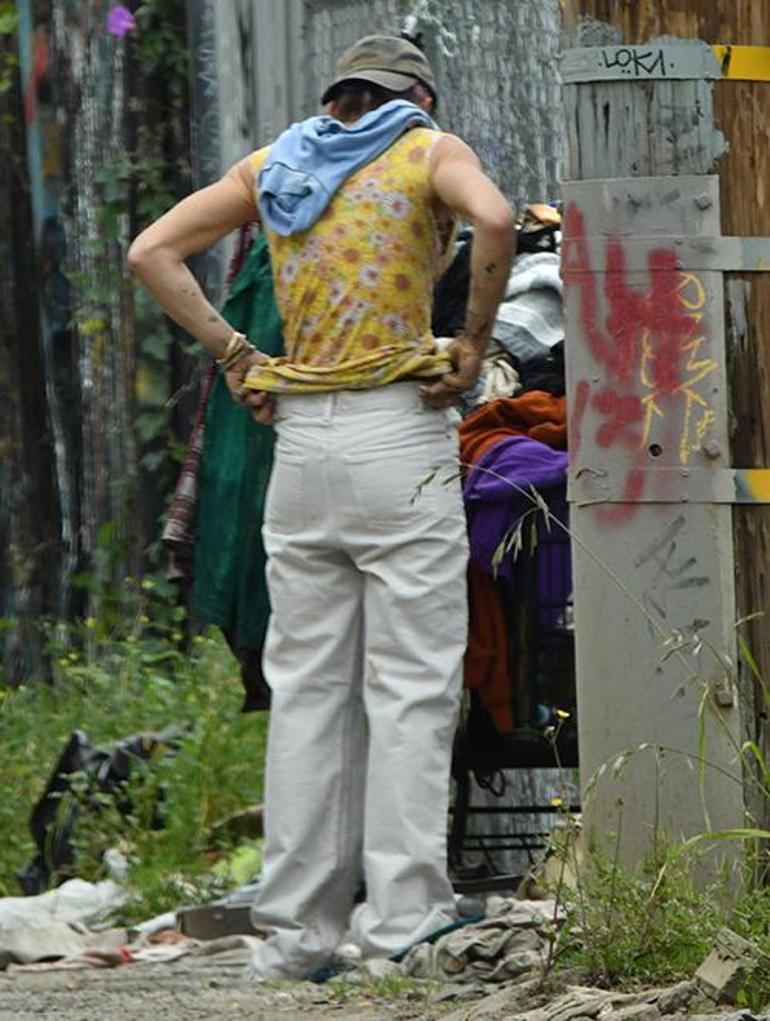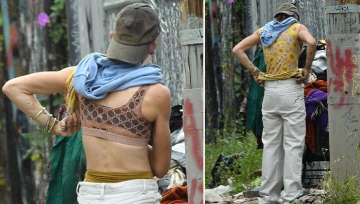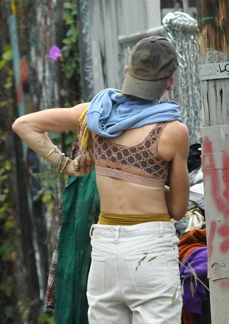 Model, Los Angeles’ta çöplüklerin olduğu bir bölgede geziniyordu. Her birinin önünde durdu ve kendine uygun giysileri araştırdı. Aralarından bazılarını seçip üzerine giyip denedi.