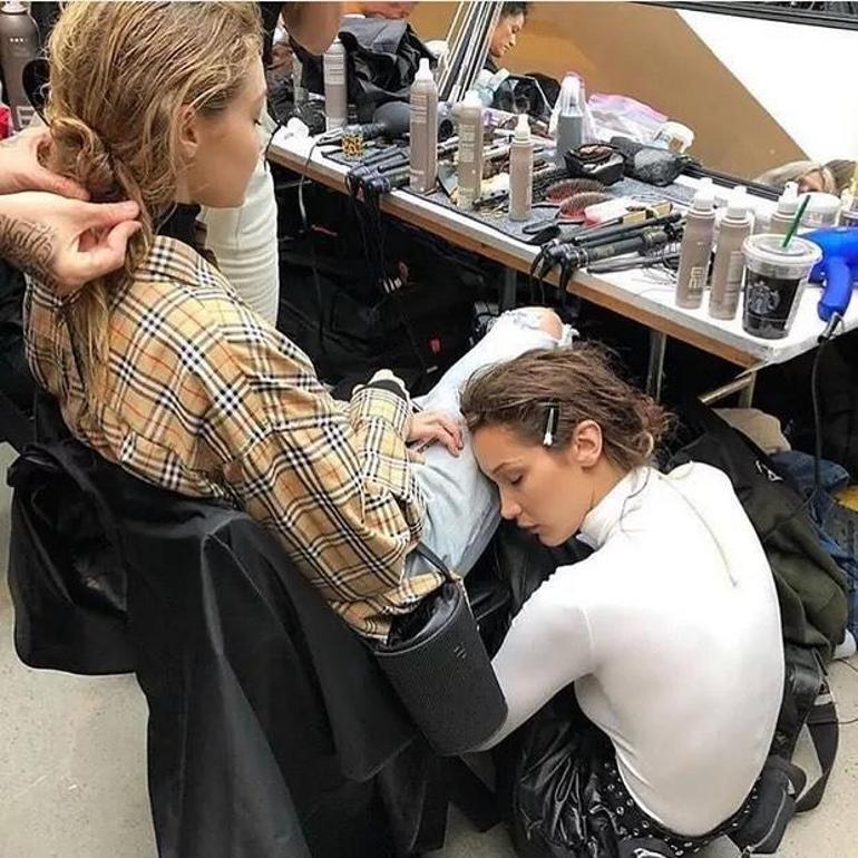 İki kız kardeş yıllardır podyumda birlikte yürüyorlar ve Bella defile aralarında dinlenirken bile hâlâ ablası Gigi’nin dizlerine yatıp dinleniyor
