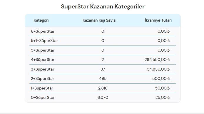 Birinci kategori olan “6 ve Süper Star bilen”, Sayısal Loto çekilişinde “6” tutturan ve Süper Star rakamını doğru tahmin eden oyunlardır;