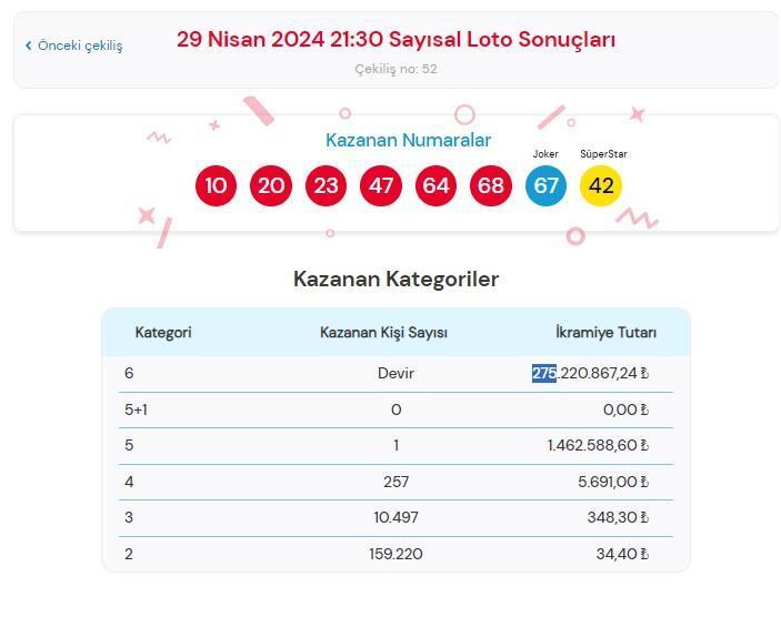 Çılgın Sayısal Loto sonuçları 29 Nisan Pazartesi akşamı yapılan çekilişin hemen ardından belli oldu. Çekiliş sonuçlarına göre 6 bilen çıkmayınca 275 milyon 220 bin 867 lira değerindeki büyük ikramiye devretti.
