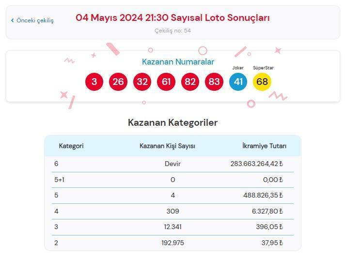 3 – 26 – 32 – 61 – 82 – 83 – Joker: 41 – Süper Star: 68