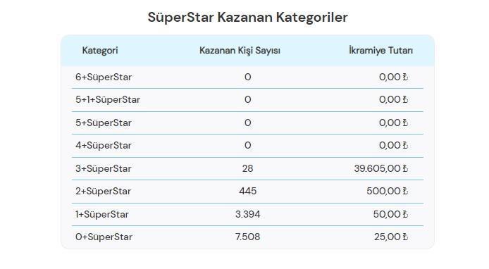 Birinci kategori olan “6 ve Süper Star bilen”, Sayısal Loto çekilişinde “6” tutturan ve Süper Star rakamını doğru tahmin eden oyunlardır;