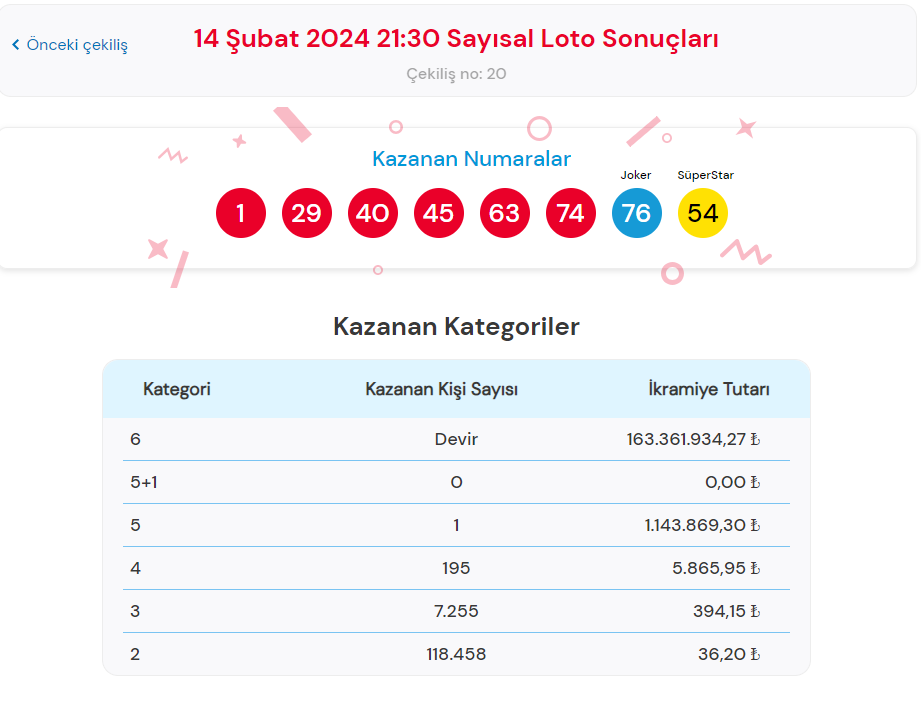 14 Şubat 2024 günü gerçekleşen çekiliş sonrası Çılgın Sayısal Loto sonuçları erişime açıldı. Çekilişte 163.361.934,27 TL ikramiye 6 bilen çıkmayınca devretti.