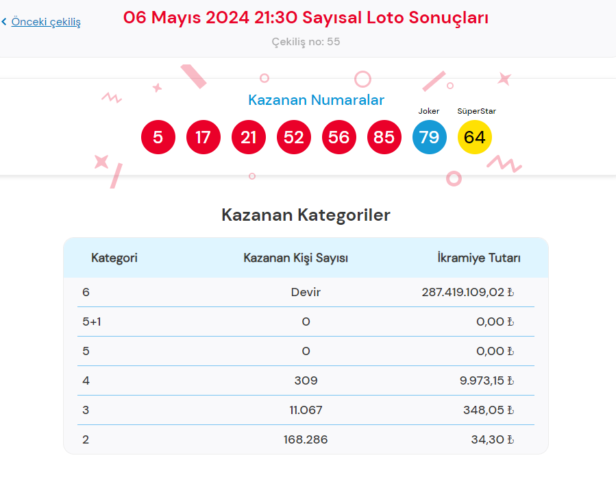 6 Mayıs 2024 günü gerçekleşen çekiliş sonrası Çılgın Sayısal Loto sonuçları erişime açıldı. Çekilişte 6 bilen çıkmadı ve tam 287.419.109,02 TL devretti.