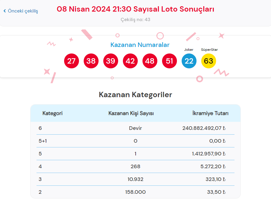 8 Nisan 2024 günü gerçekleşen çekiliş sonrası Çılgın Sayısal Loto sonuçları erişime açıldı. Çekilişte 6 bilen çıkmayınca tam 240.882.492,07 TL devretti.