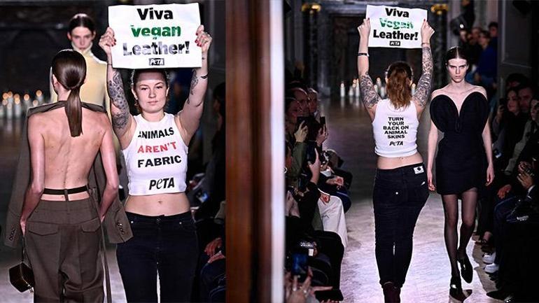 Defile devam ederken podyuma fırlayan hayvan hakları aktivistleri, modacı ve şarkıcı Victoria Beckham’ın tasarımlarını protesto ettiler.