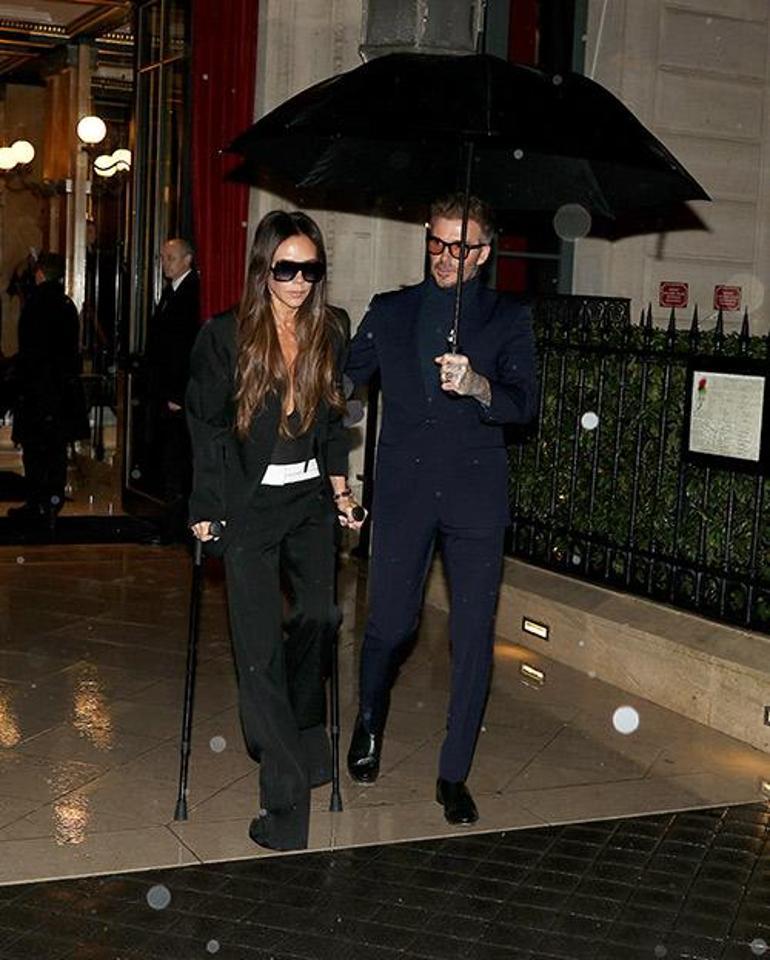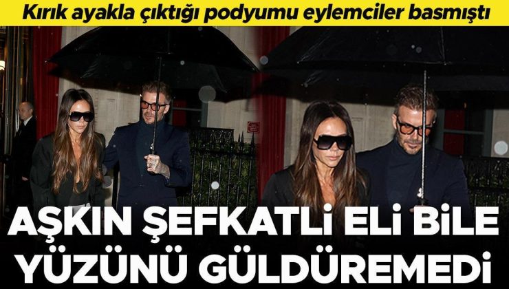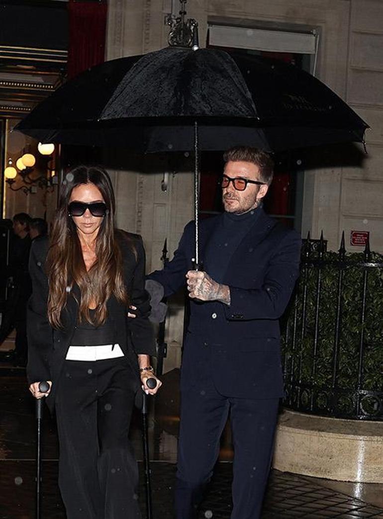 David Beckham Victoria Beckham’a yağmurda ıslanmaması için şemsiye tuttu, onu koruyup kollamak için de elini omzundan çekmedi. Ancak hem kırık ayağı hem de defilede yaşananlar yüzünden ünlü modacının yüzünden düşen bin parçaydı adeta.