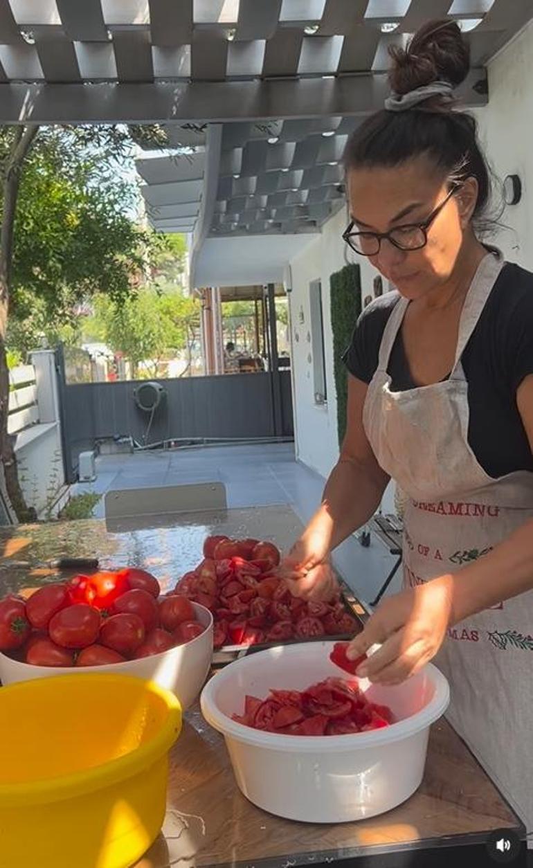 Kilo kilo domates doğrayan oyuncu mevsiminde aldığı ürünleri püre ve sos haline getirip kış aylarında tüketmek için hazırladı.