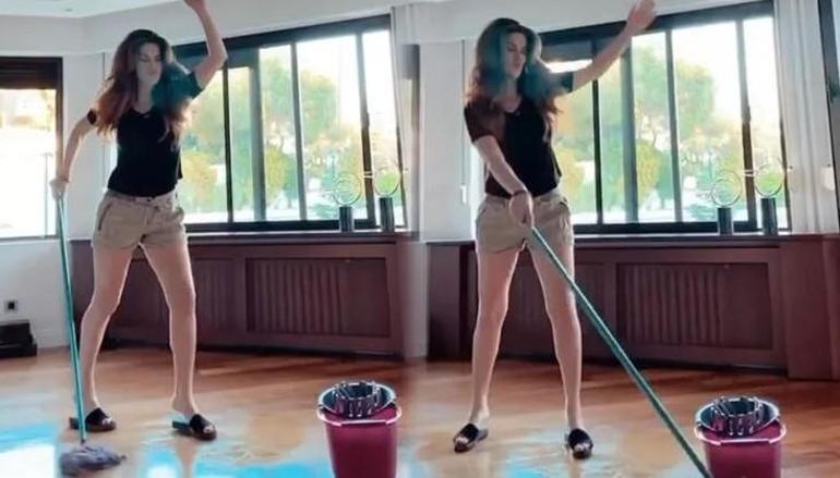 Tülin Şahin, evde temizlik yaparken çekilen fotoğraflarını Instagram’da paylaştı.
