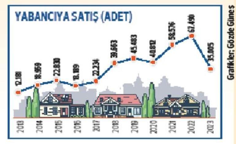 Yabancılara konut satışları 2023 yılında bir önceki yıla göre yüzde 48.1 azalarak 35 bin 5 oldu. Böylece yabancıya satışta son 6 yılın en düşük rakamı görüldü. Toplam satış içinde yabancılara satışın payı ise yüzde 2.9 olarak açıklandı. 2023 yılında yabancılara yapılan konut satışlarında ilk sırayı 12 bin 702 konut satışı ile Antalya aldı. Antalya’yı sırasıyla 11 bin 229 konut satışı ile İstanbul, 3 bin 16 konut satışı ile Mersin izledi. Rusya vatandaşları 2023 yılında Türkiye’den 10 bin 560 konut satın aldı. Rusya vatandaşlarını 4 bin 272 konut ile İran vatandaşları ve bin 917 konut ile Irak vatandaşları takip etti.