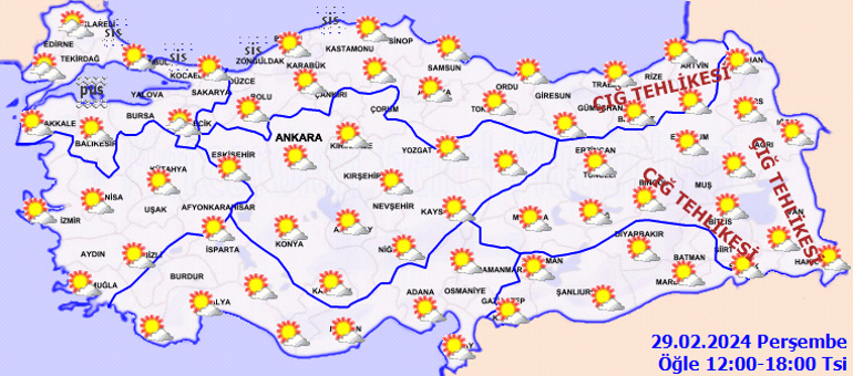 Meteoroloji Genel Müdürlüğü tarafından yapılan son tahminlere göre, yurt genelinde yağış beklenmiyor. Yurdun batı ve kuzey kesimlerinde yer yer parçalı bulutlu, diğer yerlerin az bulutlu ve açık geçeceği tahmin ediliyor. Doğu Karadeniz’in iç kesimleri ile Doğu Anadolu’nun kuzey ve doğusunda yüksek kar örtüsü bulunan yerlerde çığ tehlikesi bulunmaktadır. Gece ve sabah saatlerinde kuzey ve iç kesimlerde pus, yer yer sis bekleniyor.