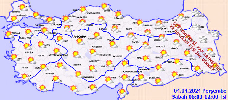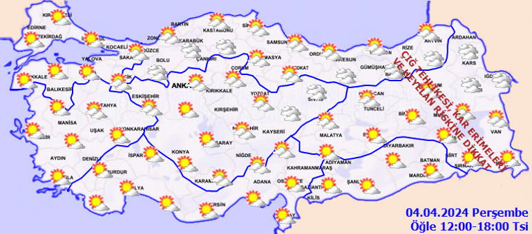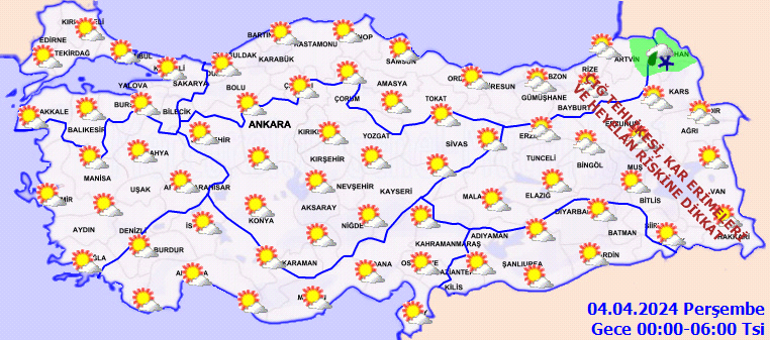 Parçalı ve az bulutlu, kuzey kesimlerinin yer yer çok bulutlu, bu akşam saatlerinde Ardahan çevrelerinin karla karışık yağmur ve yükseklerinin kar yağışlı geçeceği tahmin ediliyor. Bölgenin yüksek kar örtüsüne sahip eğimli yamaçlarında çığ tehlikesi, kar erimeleri ve heyelan riski bulunmaktadır.
