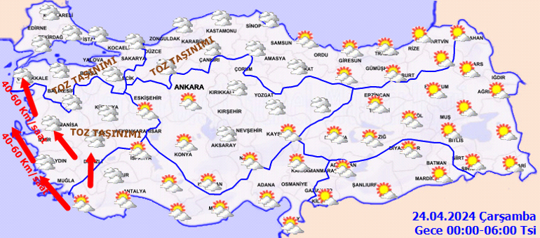 Parçalı ve az bulutlu, kuzeybatısının yer yer çok bulutlu geçeceği tahmin ediliyor. Rüzgarın güneyli yönlerden yer yer kuvvetli ve kısa süreli fırtına şeklinde (50-80 km/saat) esmesi bekleniyor. Batı kesimlerinde yer yer toz taşınımı bekleniyor.