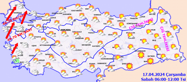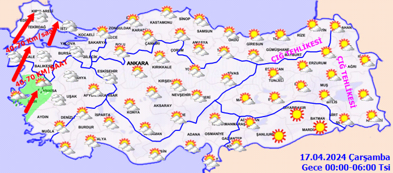 Meteoroloji Genel Müdürlüğü tarafından yapılan son değerlendirmelere göre, ülkemizin batı kesimlerinin yer yer çok bulutlu, İzmir ve Manisa ile Muğla’nın kuzeybatı, Aydın’ın batı kesimlerinin yerel sağanak ve gök gürültülü sağanak yağışlı, diğer yerlerin parçalı ve az bulutlu geçeceği tahmin ediliyor. Doğu Karadeniz’in iç kesimlerinin yüksekleri ile Doğu Anadolu’nun yüksek ve dik yamaçlarında çığ tehlikesi devam etmektedir.
