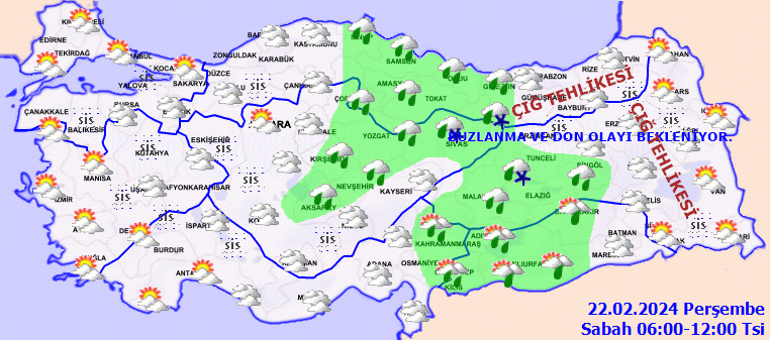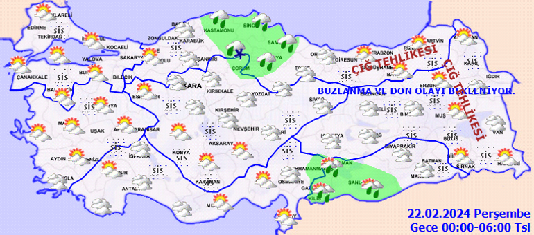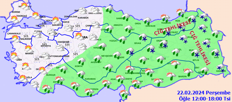Meteoroloji Genel Müdürlüğü olarak Yapılan Son Değerlendirmelere göre, ülkemiz genelinin parçalı ve yer yer çok bulutlu, Akdeniz, İç Anadolu’nun güney ve doğusu, Orta ve Doğu Karadeniz, Doğu ve Güneydoğu Anadolu bölgeleri ile bu akşam saatlerinde Karabük, Bartın, Kastamonu ve Sinop çevrelerinin aralıklı yağışlı geçeceği tahmin ediliyor. Yağışların genellikle yağmur ve sağanak, Doğu Karadeniz’in iç kesimleri, İç Anadolu’nun kuzeydoğusu, Doğu Anadolu’nun kuzey ve doğusu ile bu gece Kastamonu çevrelerinde karla karışık yağmur ve yer yer kar şeklinde olması bekleniyor. Doğu Karadeniz’in iç kesimleri ile Doğu Anadolu’nun kuzey ve doğusunun kar örtüsüne sahip eğimli yamaçlarında çığ tehlikesi bulunmaktadır. Bu gece ve yarın (Perşembe) sabah saatlerinde İç ve doğu kesimlerde pus ve yer yer sis ile birlikte doğu kesimlerde yer yer buzlanma ve don olayı bekleniyor.