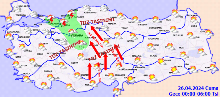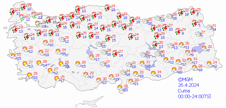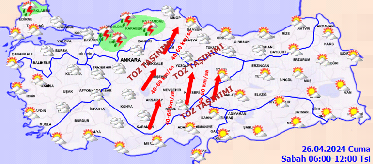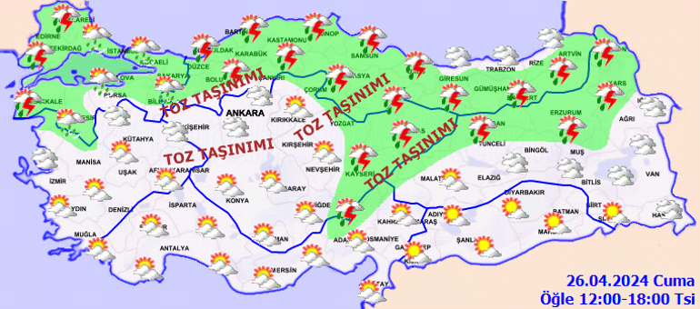 Meteoroloji Genel Müdürlüğü tarafından yapılan son değerlendirmelere göre, ülkemiz genelinin parçalı yer yer çok bulutlu, Marmara, İç Anadolu’nun kuzeydoğusu, Batı ve Orta Karadeniz, Doğu Karadeniz’in iç kesimleri, Doğu Anadolu’nun kuzeyi, Doğu Akdeniz’in Toroslar kesimi ile Afyonkarahisar, Eskişehir ve Ankara çevrelerinin sağanak ve gök gürültülü sağanak yağışlı geçeceği tahmin ediliyor. İç Anadolu ile Batı Karadeniz’in iç kesimlerinde yer yer toz taşınımı beklenmektedir.