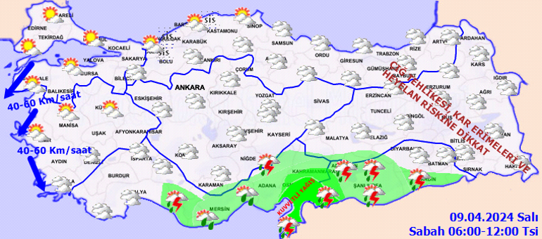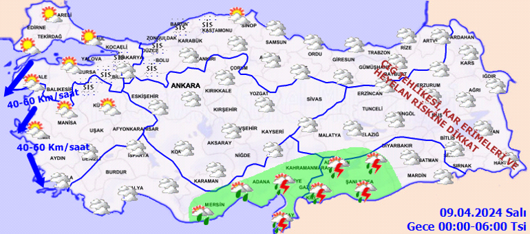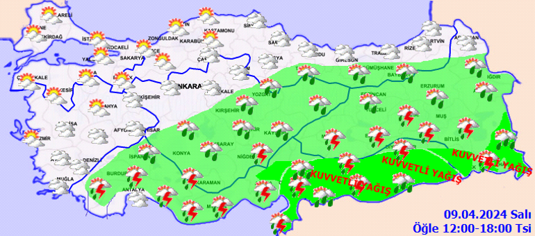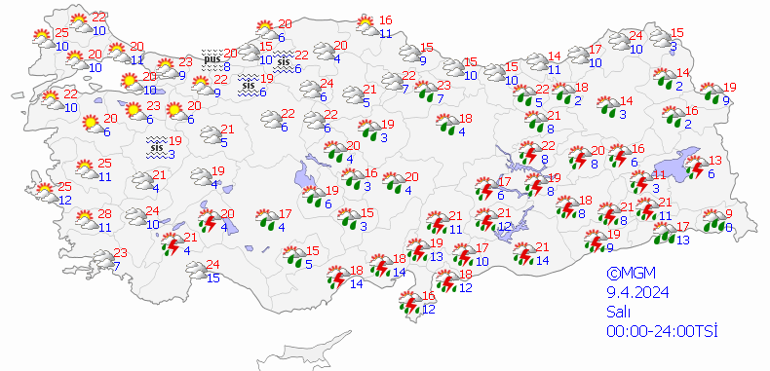 Meteoroloji Genel Müdürlüğü tarafından yapılan son değerlendirmelere göre: Ülkemiz genelinin parçalı yer yer çok bulutlu, Batı Akdeniz’in iç kesimleri, Doğu Akdeniz, İç Anadolu’nun güney ve doğusu, Doğu Karadeniz’in iç kesimleri ile Doğu ve Güneydoğu Anadolu’nun sağanak ve gök gürültülü sağanak yağışlı geçeceği tahmin ediliyor. Yağışların; Doğu Akdeniz, Güneydoğu Anadolu ile Şırnak, Van’ın güney ve doğusu ile Hakkari’de aralıklı ve yerel olarak kuvvetli olması bekleniyor. Marmara’nın güney ve doğusu ile Batı ve Orta Karadeniz’de yer yer sis ve pus hadisesi görüleceği tahmin ediliyor.