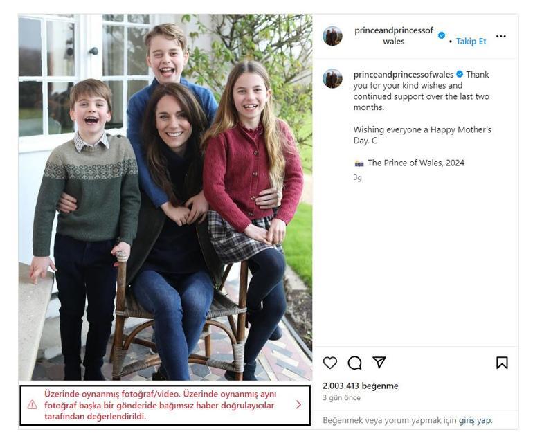 Geçtiğimiz hafta pazar gününün İngiltere’de Anneler Günü olarak kutlanması bu alevleri söndürmek için iyi bir fırsattı. Galler Prensi ve Prensesi’nin halkla ilişkiler ekibi de aynı şekilde düşünmüş olacak ki çiftin resmi sosyal medya hesaplarından, Kate’in üç çocuğu George, Charlotte ve Louis’i kucaklayan bir fotoğrafı paylaşıldı. Fotoğrafa ilişkin metinde de Kate bizzat tüm annelerin Anneler Günü’nü kutluyordu. Prens William’ın çektiği vurgulanan fotoğraf kısa süre içinde yüz binlerce beğeni aldı, İngiltere basınında manşetlere taşındı hatta AFP, AP gibi uluslararası haber ajansları tarafından da abonelere servis edildi.