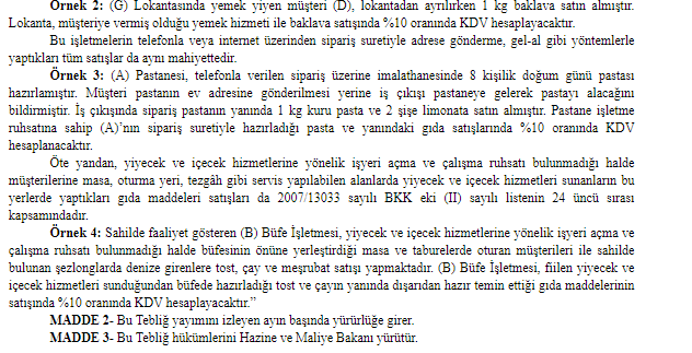 “Bu işletmeler prensip olarak hizmet işletmesi mahiyetinde olduklarından buralarda imal edilen veya dışarıdan temin edilen gıda maddelerinin buralarda veya dışarıda tüketilmek üzere müşterilere satışında %10 (alkollü içeceklerde %20) oranında KDV hesaplanır.