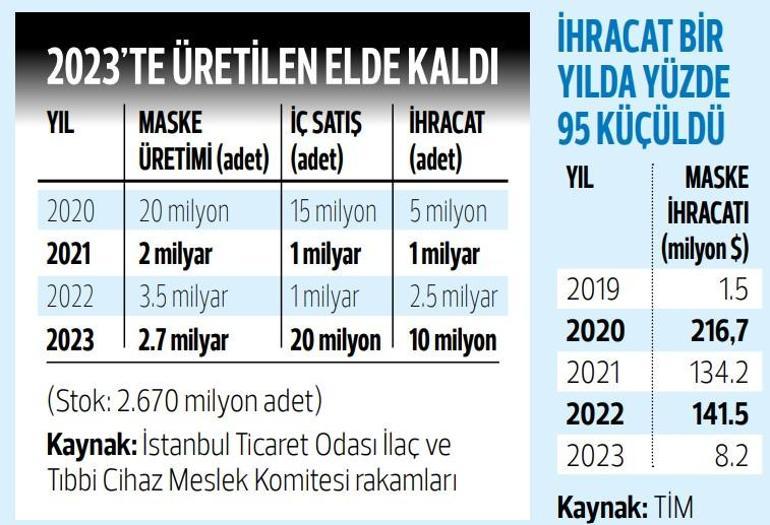 Hürriyet’e konuşan İstanbul Ticaret Odası İlaç ve Tıbbi Cihaz Meslek Komitesi Başkanı Cengiz Balçık, büyük maske üreticilerinin uzun süredir üretimi durdurduğunu hatta maske makinelerini elden çıkardığını söyledi. Cengiz, “Pandeminin akut döneminde yaklaşık 50 milyon dolarlık maske makinesi alımı yapıldı. Herkes kalitesine dikkat etmeksizin üretim yaptı. Çok iyi satışlar oldu, ihracat patladı. Bu yatırımı sektör geri aldı elbette” dedi. Cengiz Balçık’ın verdiği bilgilere göre, yaklaşık bir yıldır üreticiler maske satışı yapamıyor. Balçık bu gelinen tabloyu şöyle anlattı: “Yaklaşık bir yıldır ne yurtiçinden ne de yurtdışından talep var. Üretilen maskeler elde kaldı. Şu anda piyasada 2.6 milyar adet maske stokta bekliyor. Ben de büyük üreticilerdendim, üretmiyorum. 100 bin dolarlarla alınan maske makineleri 4-6 bin dolar arasında parayla elden çıkarıldı. Bazıları depoya koydu ama piyasanın çoğu makinesini sattı.”