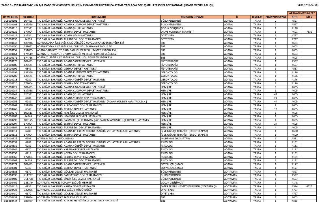 Sağlık Bakanlığı taşra teşkilatı hizmet birimlerinde istihdam edilmek üzere 657 sayılı Devlet Memurları Kanunun 4 üncü maddesinin (B) fıkrası ile 663 sayılı Kanun Hükmünde Kararnamenin 45/A maddesi kapsamında 27.000 sözleşmeli personel Kamu Personel Seçme Sınavı (KPSS) sonucuna göre ÖSYM tarafından yapılacak merkezi yerleştirme ile alınacaktır.