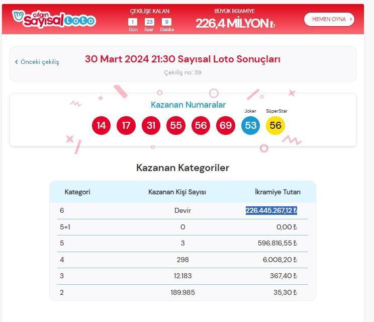 Çılgın Sayısal Loto 30 Mart çekilişi sonucunda 6 bilen çıkmayınca büyük ikramiye devretti. Devreden ikramiye tutarı 226 milyon 445 bin 267 lira olarak tespit edildi.
