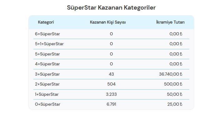 Birinci kategori olan “6 ve Süper Star bilen”, Sayısal Loto çekilişinde “6” tutturan ve Süper Star rakamını doğru tahmin eden oyunlardır;