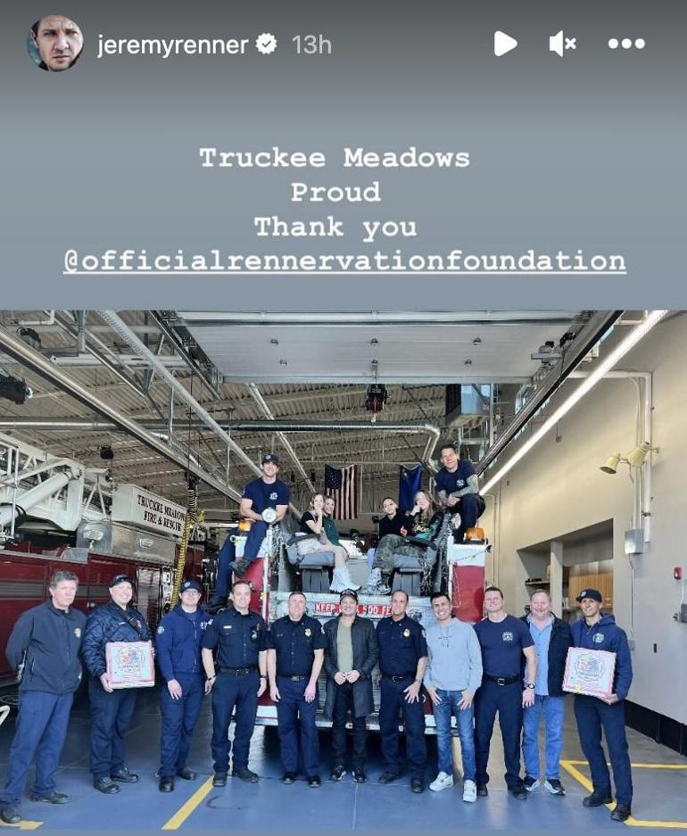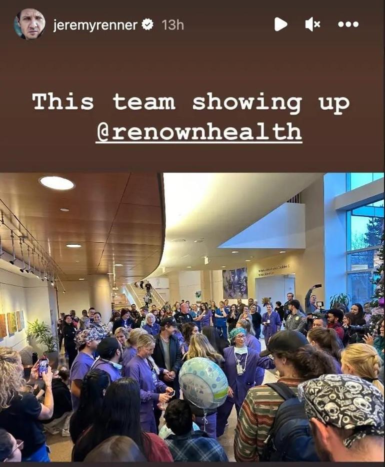 Fotoğrafları sosyal medya hesabından paylaşan Jeremy Renner “Size neşe ve bereketle sesleniyorum. Renown hastanesindeki süper kahramanları, ilk müdahale ekiplerini ve doktorları, hemşireleri ve personeli görmek için uğradım” dedi ve onlara “Size saygılarımı sunuyorum ve sevgiyi, hayatı ve hepimize getirdiği nimetleri kutluyorum. Bana burada bakıp hayatımı kurtardığınız için size ve bu topluluğa teşekkür ederim” diye seslendi.
