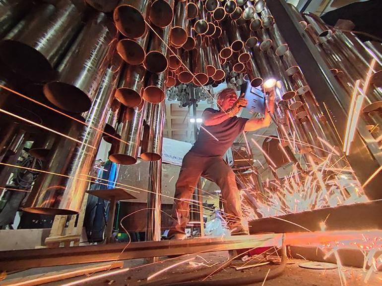 Bu tarz tasarımların bilgisayar üstünde çizimi tamamlandığında kurgulanması kolay. Ancak gerçeğe dönüşmesi ayrı bir hikaye. Heykelde kullanılan borular Türkiye’de üretilmiyor, yurt dışından getirildi ve şu anda dünyada daha iyi bir paslanmaz çelik modeli yok. Heykelin çok karmaşık olan geometrilerini ortaya çıkarmak için lazer kesim yaptık. Yani var olan en yüksek teknolojiden faydalanıldı. Kullandığım teknikle, Cumhuriyetin 50’nci yılı anısına Heykeltıraş Şadi Çalık tarafından aynı tip borularla yapılan ve İstanbul Galatasaray Meydanı’nda sergilenen heykele de atıfta bulunmak istedim. O da çok eskiden beri herkesin sevdiği ve kabul ettiği bir heykel. O çalışmayı hatırlatmak için ben de heykel yapımında paslanmaz çelik kullandım.”