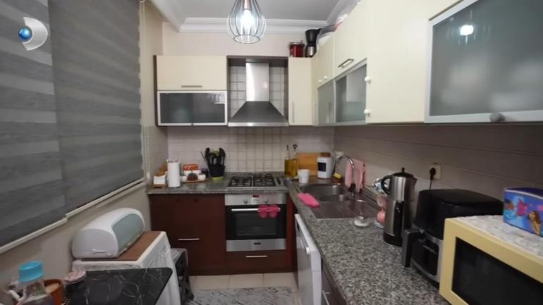 Mutfakta ise gri ve toprak tonlarının hakim olduğu dolaplar dikkat çekiyor. Ev genel olarak gösterişten uzak sade bir dizayna sahip.