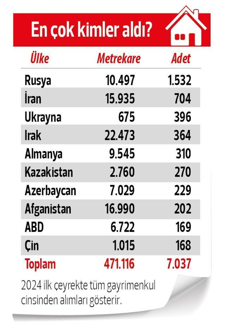 Tüm gayrimenkul yatırımları incelediğinde, Türkiye’den alım yapan yabancılar arasında yüzölçümü bazında ilk sırada Irak yer aldı. Irak’ı Afganistan, İran, Rusya Federasyonu, Almanya, Azerbaycan, Amerika Birleşik Devletleri, Kazakistan, Çin ve Ukrayna takip etti. 2024 yılı ilk 3 ay itibariyle Türkiye genelinde yabancılara yapılan toplam gayrimenkul satış adetinde ise geçtiğimiz sene de ilk sırada yer alan Rusya ilk sırayı aldı. Rusya’yı İran, Ukrayna, Irak, Almanya, Kazakistan, Azerbaycan, Afganistan, Amerika Birleşik Devletleri ve Çin izledi.