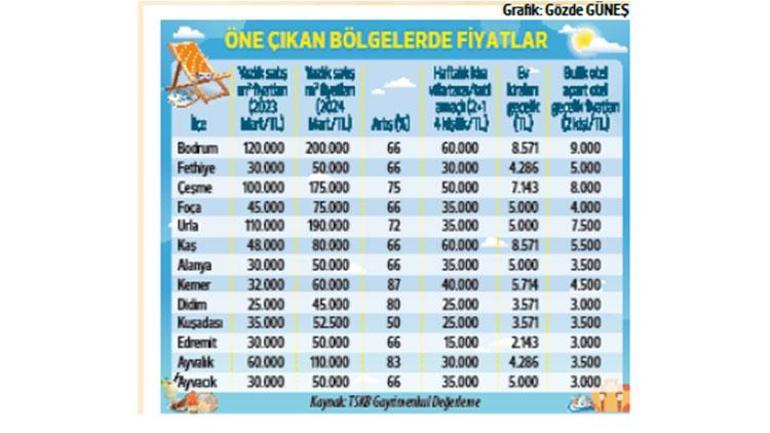 -Yaz tatilinin popüler ilçesi Bodrum hem ortalama kira hem de satış fiyatında zirvede. Bölgede Mart 2023-Mart 2024 döneminde metrekare satış fiyatı yaklaşık yüzde 66 arttı ve 200 bin liraya kadar çıktı. Böylece 100 metrekare evde ortalama fiyat 20 milyon liraya ulaştı. Villa tipi 2+1 yazlığın haftalık kirası ise ortalama 60 bin lira.